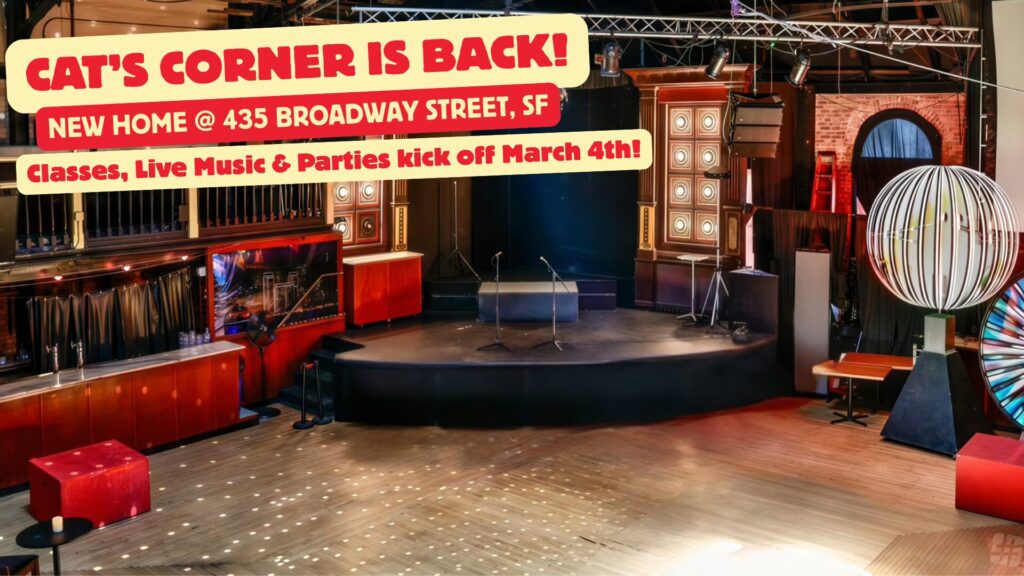 Cat’s Corner is stepping into its newest—and most exciting—life at 435 Broadway Street, right in the heart of North Beach, San Francisco. Just steps from the historic Barbary Coast, this neighborhood has been a home for jazz, nightlife, and social dancing for over a century—making it the perfect place to bring swing dancing back where it belongs.